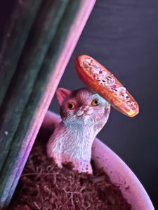 この通りなんとも言えぬ虚無的な表情でピザを回す姿に惚れ込み私の部屋の植物の守り神として連れ帰った次第にございます。