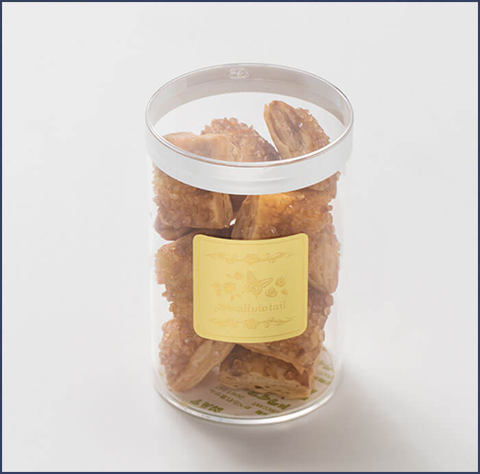 時任お勧めの、和風な味付けのパイでございます。ざらめ糖と醤油の甘じょっぱい一口パイでございます。 アレルギー: 小麦・乳・大豆