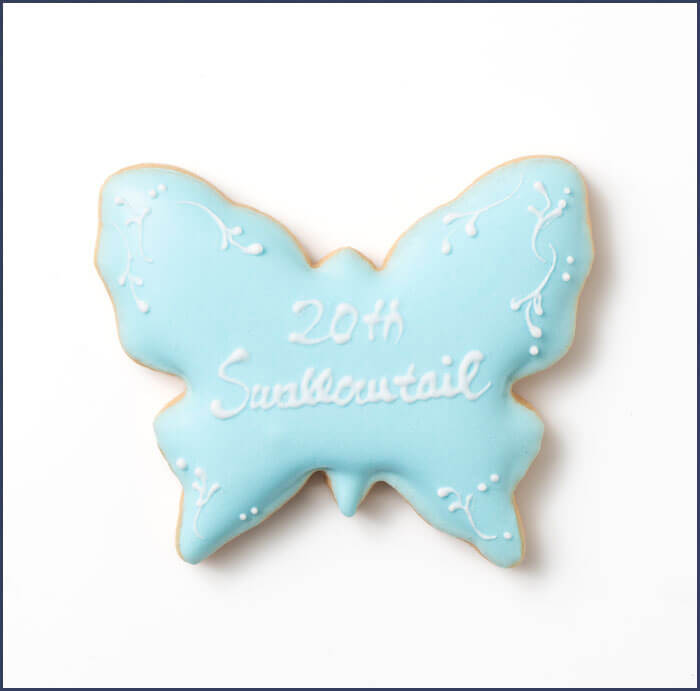 ティーサロン20周年を記念し、蝶をモチーフにいたしましたアイシングクッキーを特別にご用意いたしました。 アレルギー:小麦・乳・アーモンド・卵注)こちらの商品は割れやすいお品物となります為破損した場合でも商品の交換・返品は致し兼ねますので予めご了承くださいませ。